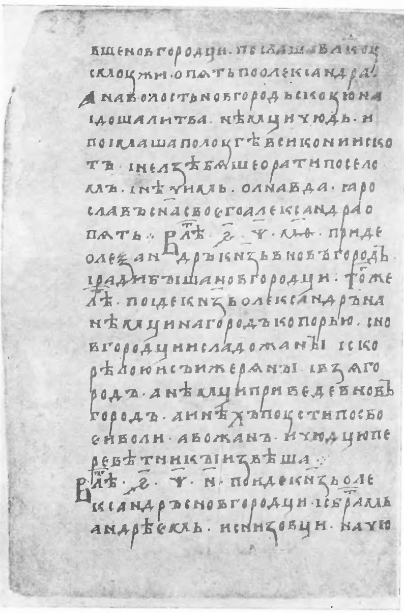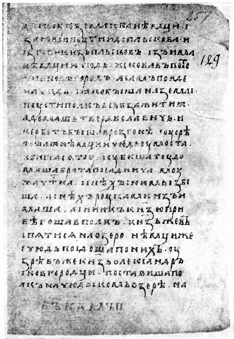 Рис. 3. Текст рассказа о Ледовом побоище Новгородской 1-й летописи старшего извода под 1242 г. (рукопись, Государственный исторический музей, Синодальное собрание, № 786, лл. 128 об. — 129)