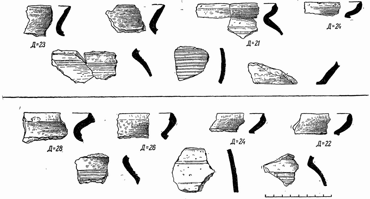 Рис. 5. Фрагменты керамики. Вверху — Старые Гривки; внизу — у дер. Кола. Д — диаметр сосуда (в см)