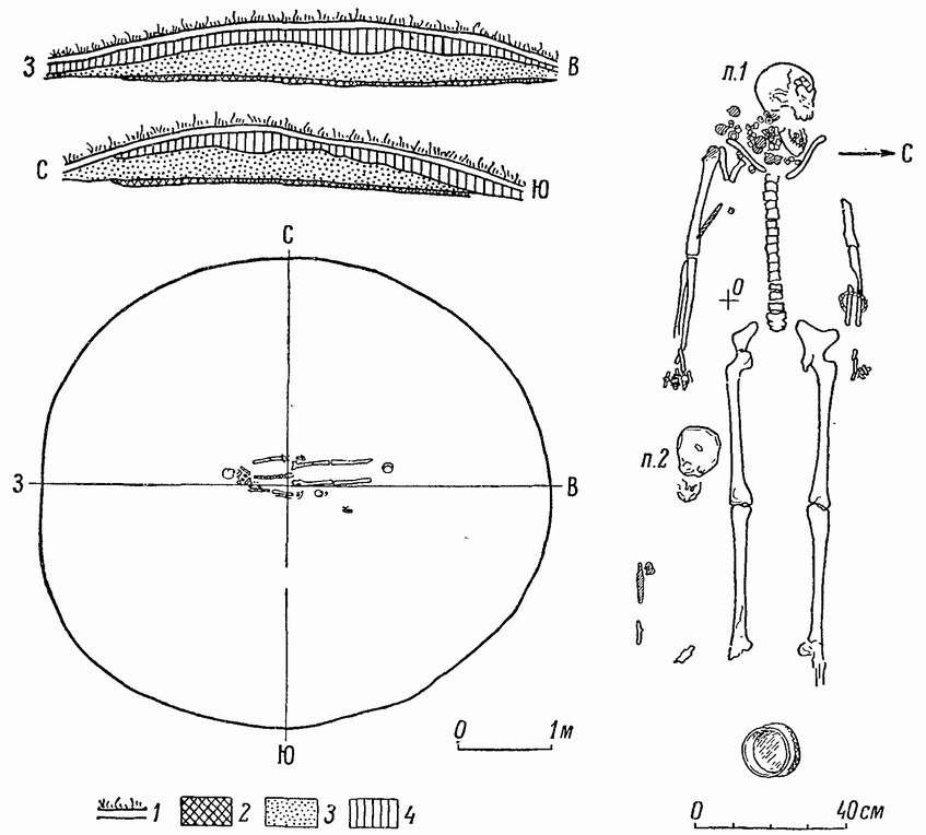 Курган № 1, в северной части могильника. Уплощенная насыпь диаметром 5 м и высотой 0.7 м. Состав насыпи — песок, В центре кургана на слое погребенной почвы обнаружено двойное захоронение женщины и ребенка (рис. 6).