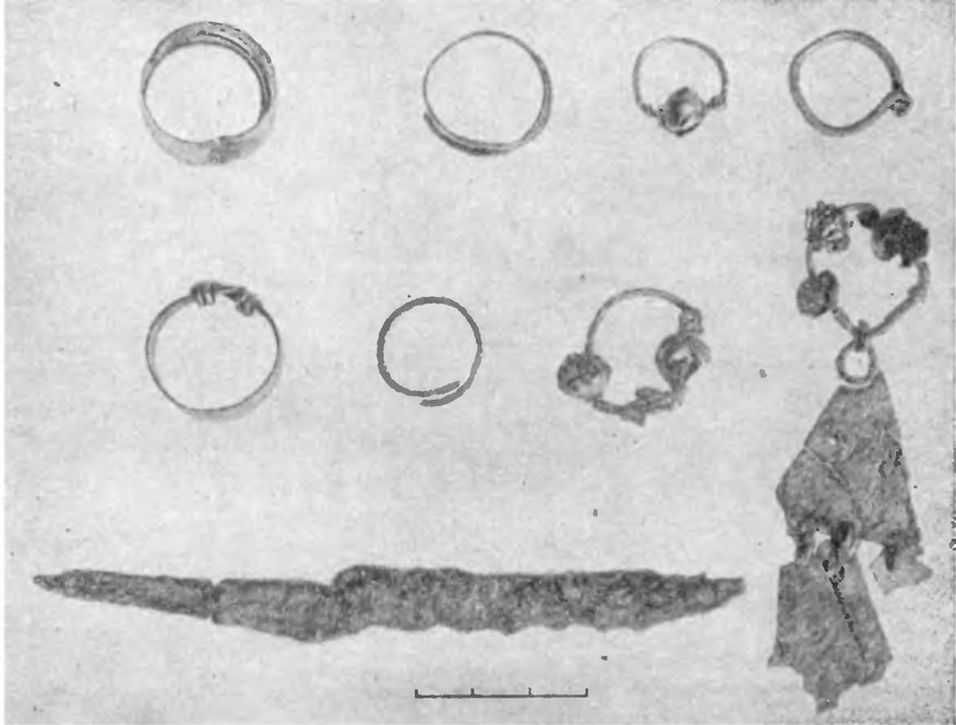 Близ правого плеча погребенной лежал железный нож, а на фалангах пальцев правой руки — четыре бронзовых кольца: