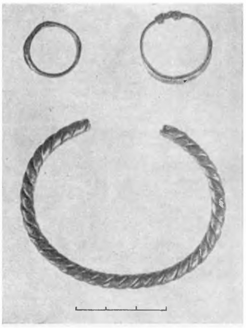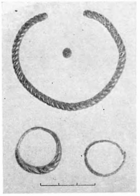 На левой руке погребенной обнаружены (рис. 8): 1) бронзовый браслет, витой в 3 проволочки, с обрубленными концами; 2) на фалангах пальцев 2 кольца — бронзовое проволочное спиральное и серебряное пластинчатое с завязанными концами и вогнутым щитком.