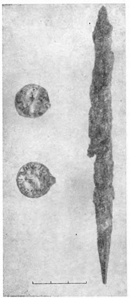 В одном разрушенном кургане удалось обнаружить следы захоронения. Здесь были найдены небольшие куски человеческих костей, не имеющие следов пребывания в огне, древесные угли, железное копье, куски разбитого горшка, железный гвоздь и остатки ткани с нашитыми бронзовыми украшениями (рис. 4).