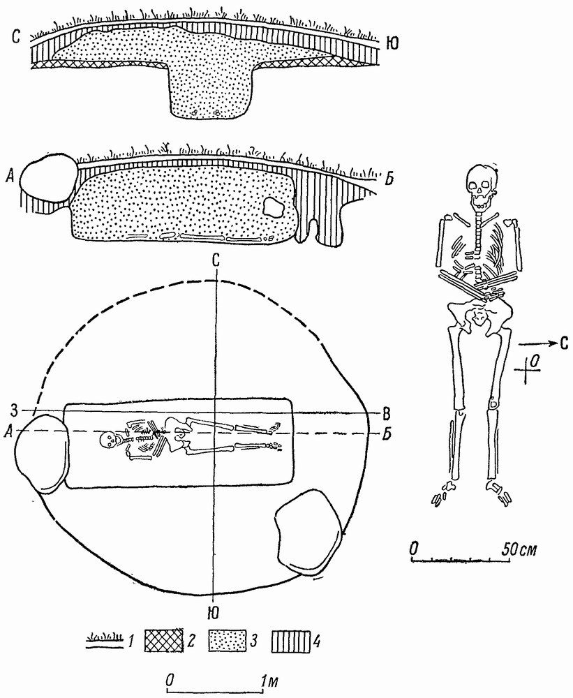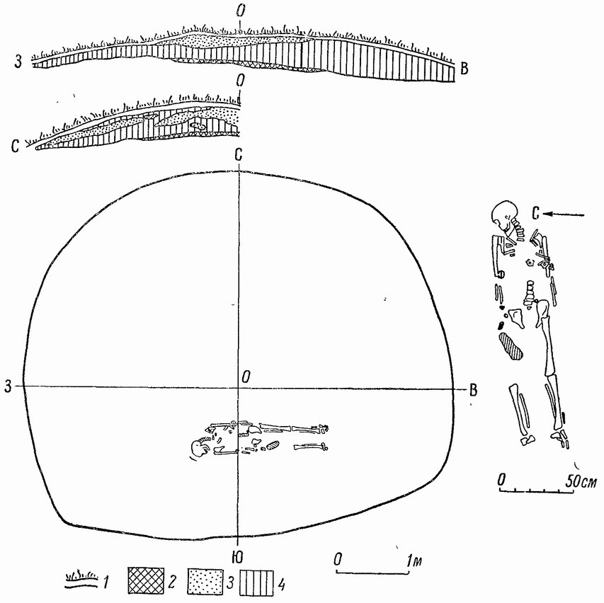 Под насыпью, несколько к югу от центра, на слое погребенной почвы обнаружено мужское погребение. Костяк лежит на спине, головой на запад, сохранность костей плохая; позвонки, ребра и часть костей конечностей не сохранились. Возраст погребенного — возмужалый. Череп европеоидного северного типа.