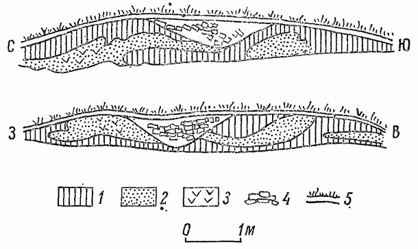 Характер слоя во всех раскопах оказался одинаковым. Дерновый слой, желтый рыхлый песок и подстилающий его плотный песчаный материк были прослежены всюду, хотя мощность этих составных частей была различной. Установлено, что всхолмление образовано желтым рыхлым песком, слой которого достигал наибольшей мощности в раскопе № 1, где его толщина измерялась 60—80 см, с уменьшением к юго-востоку до 15 см. В раскопах №№ 2 и 3 этот слой песка был более нарушен кладоискательскими ямами и другими перекопами.