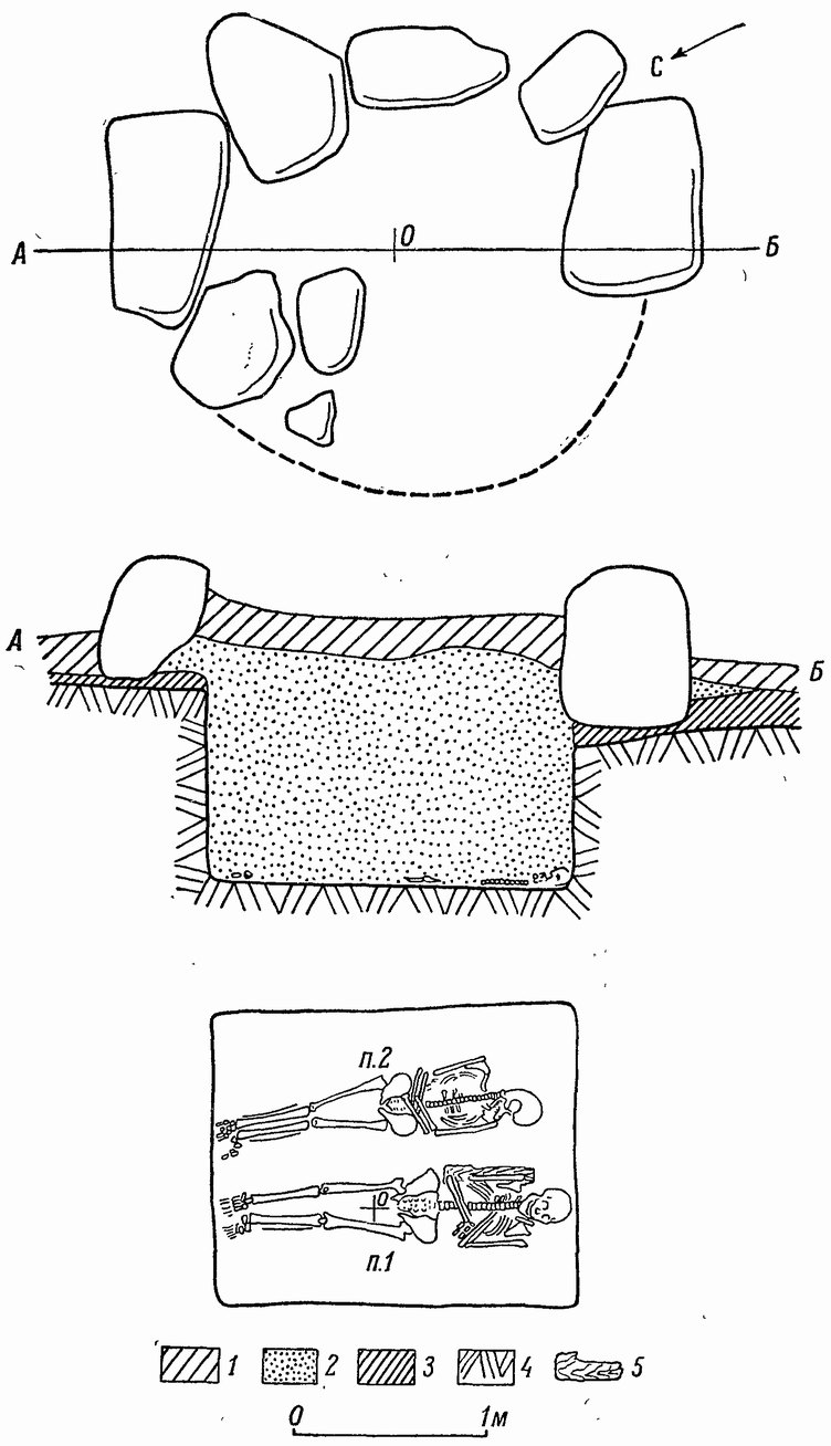 Жальник расположен на расстоянии около 30 м к юго-западу от кургана № 4. Он представляет собой могилу, плоская насыпь которой поднимается на 0.2 м выше уровня погребенной почвы и окружена валунами и плитами. Эта каменная ограда могилы прерывается только с западной стороны (рис. 16).