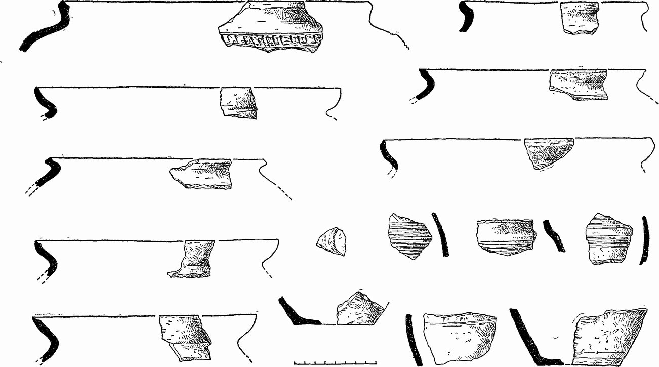 На острове не имеется никаких следов городища или других искусственных укреплений. Вся средняя и северная часть острова сильно заболочены. Полоса более высокой и сухой местности проходит вдоль южного берега острова. В западной части этой повышенной гряды имеется культурный слой. Шурфы показали, что этот культурный слой представляет собой чередующиеся прослойки темного гумуса и песка. В слое (как в гумусе, так и в песке) встречаются фрагменты керамики, относящиеся, очевидно, к XII—XIII вв., а быть может, частично и к XIV в. (рис. 17). Слой очень влажный; шурфы доведены до глубины 0.75 м, ниже слой уходит в воду. Наибольшее количество керамики встречается сразу же под дерном на глубине до 0.4 м, однако находки имеются вплоть до уровня воды.