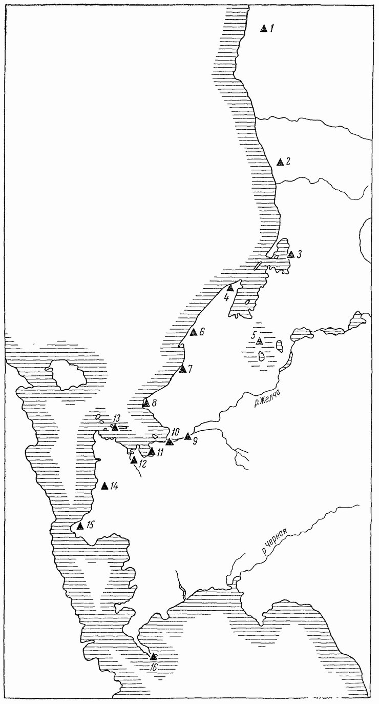 Так, прежде всего обращает на себя внимание то обстоятельство, что в этом районе не обнаружено ни одного более или менее значительного поселения. Правда, сплошного археологического обследования всей территории здесь не производилось, но все же тщательный опрос местных жителей и обследование мест, где было наиболее вероятно ожидать наличия поселений, не дали никаких результатов, несмотря на то, что были обнаружены следы нескольких совсем мелких поселений XII—XIII вв. у деревень Раскопель, Островцы, Кола, в устье р. Желчи, на о. Городецкий.