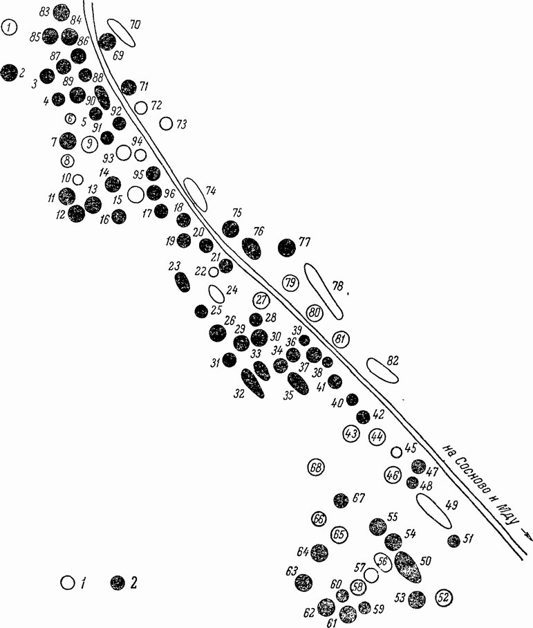 Рис. 2. Курганный могильник у дер. Залахтовье. Цифры обозначают номера курганов. 7 — нетронутые курганы; 2 — раскопанные курганы