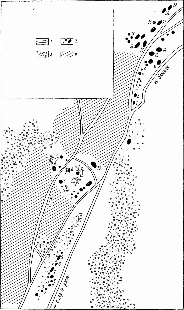 Рис. 3. Курганный могильник у дер. Островцы. Цифры обозначают номера курганов. 1 — дороги; 2 — курганы; 3 — лес; 4 — поля