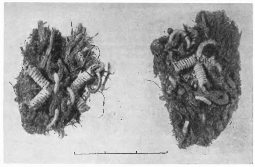 Вблизи черепа найдены также проволочные серебряные серьги (рис. 7). У правой стороны черепа лежали две серьги с замком в виде завернутых концов проволоки. На одной из серег имелась полая шаровидно-ребристая бусина, на другой серьге — три такие же бусины. У левой стороны черепа лежали также две серьги — одна гладкая проволочная, вторая с тремя бусинами, причем две из них полые шаровидные, а третья, средняя — филигранная ажурная. Кроме того, к нижней части этой серьги прикреплена двухъярусная шумящая подвеска, состоящая из трапециевидной пластинки, орнаментированной кружками, и трех подвешенных к ней таких же пластинок несколько меньшего размера.11