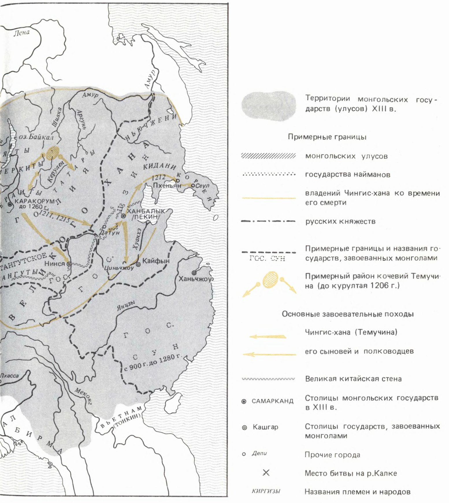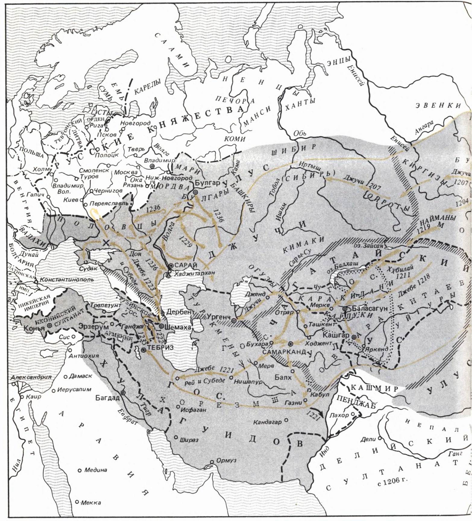 Народы под властью монголов в XIII в. и походы монгольских войск до 1236 г. (составлена на основании карты И.А. Голубцова)