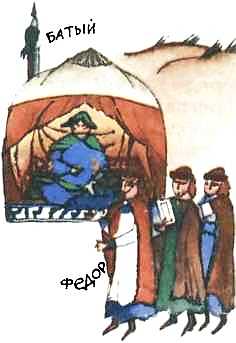 Сколь странно было посольство «чародейки», столь же вызывающе издевательским был и ответ Батыя на посольство князя Федора. Повесть о разорении Рязани Батыем, написанная в XIII веке, рассказывает, что Батый, потребовав себе жен и дочерей русских, объявил Федору: «Дай мне, княже, видети жены твоей красоту». Рязанскому послу ничего не оставалось, как ответить: «Не полезно бо есть нам, христианам, тебе, нечестивому царю, водити жены своя на блуд. Аще нас приодолееши, то и женами нашими владети начнеши».