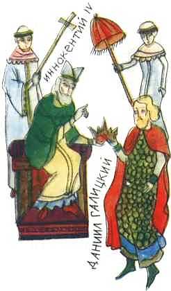 Римской курии не удались крестовые походы шведов и немецких рыцарей, здесь же добыча сама шла в руки. Иннокентий IV засыпал письмами Даниила, отправил в Галич доминиканского монаха Александра для наставлений князя догматам католической веры, разрешил множество религиозных послаблений, которые облегчили бы слияние церквей, запретил крестоносцам приобретать русские земли. В 1 253 году папа разослал буллы ко всем католическим государям, скорее всего не веря, что они откликнутся на призыв двинуться в крестовый поход, но этой демонстрацией подталкивая Даниила принять католичество.