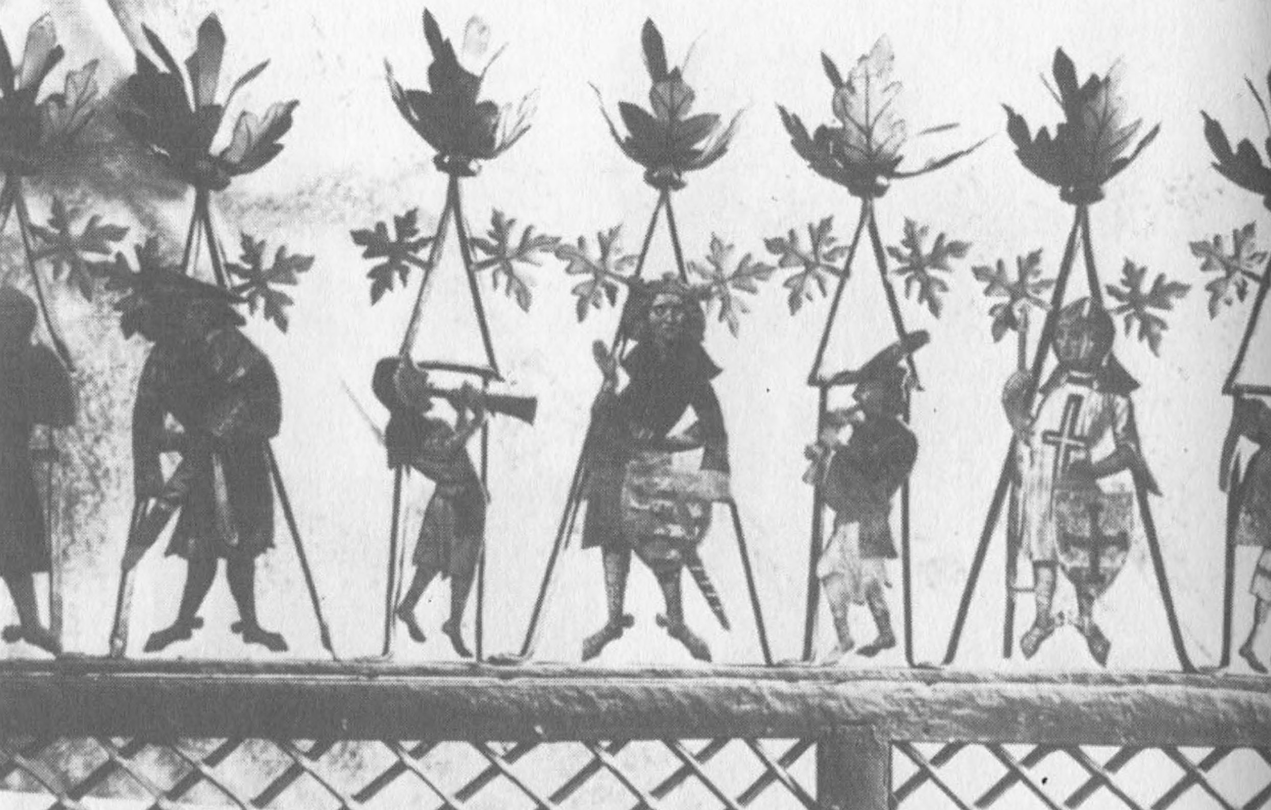 Судя по изображенным людям, ограда была сооружена в память об их встрече на могиле святой Елизаветы в 1326 г., то есть о церковной мессе политического значения, подобной отслуженной в 1236 г. (см. с. 43—44). Представлены (начиная с верхнего левого угла): Иоганн фон Дембах, бургграф Фридрих IV Нюрнбергский, музыкант с духовым инструментом, ландграф Отто Гессенский, музыкант с волынкой, комтур Немецкого ордена в Марбурге Куно фон Дудельсдорф, музыкант с духовым инструментом, ландграф Генрих Гессенский, маркграф Людвиг Бранденбургский, король Людвиг Баварский, музыкант с двумя духовыми инструментами, король Фридрих Красивый и граф Иоганн I фон Цигенхайн. Иоганн фон Дембах был в 1326 г. гессенским должностным лицом в Марбурге, бургграф Нюрнбергский оказывал всестороннюю помощь королю Людвигу, ландграф Отто сначала стоял на стороне соперника Людвига, короля Фридриха Красивого, но впоследствии перешел на сторону Людвига. Генрих Гессенский был сыном Отто, а маркграф Бранденбургский — сыном короля Людвига. Король Фридрих с 1325 г. был признан соправителем короля Людвига — вероятно, именно поэтому он изображен на ограде, хотя в 1326 г. в Марбурге его наверняка не было. Граф фон Цигенхайн был племянником ландграфа Отто по материнской линии. В 1323 г. он встал на сторону короля Людвига, но в конце 1326 г., как и ландграф Отто, переметнулся на сторону Папы. Визит короля Людвига все же не обеспечил королю прочного союза с участниками встречи. Рыцари Немецкого ордена в XIII—XIV вв. носили плащи с изображением небольшого креста на левом плече (ил. 4). Напротив, комтур Немецкого ордена изображен с большим крестом на груди. Необычно то, что концы креста изогнуты.