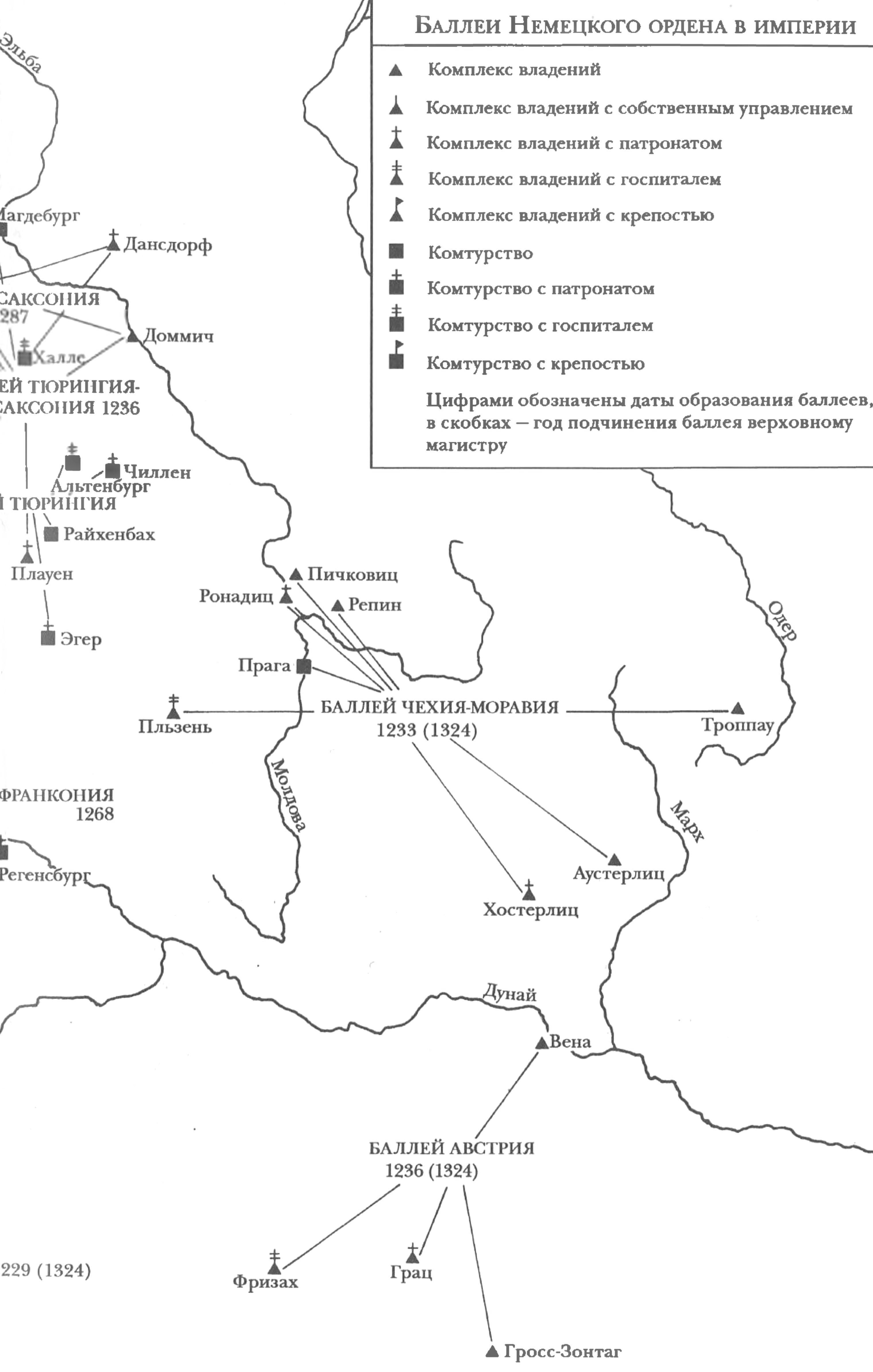 В период между 1254 и 1258 гг. vir nobilis (лат.; благородный муж. — В.М.) Конрад фон Хорнек с сыном Вернером пожаловали ордену свое владение, а сами вступили в орден. Они стали первыми комтурами Хорнека, служившего резиденцией немецкого магистра; замок был разрушен во время Крестьянской войны 1525 г. Дарение Хорнека стоит в одном ряду с акциями ландграфов Тюрингских Конрада и Генриха в Марбурге (см. с. 40—41) и трех братьев Гогенлоэ, в 1219 г. основавших комтурство Мергентхайм. При этом учредители, по крайней мере некоторые из них, вступают в орден. Хозяева Хорнека были последними в династии представителями мужского пола, и она угасла.