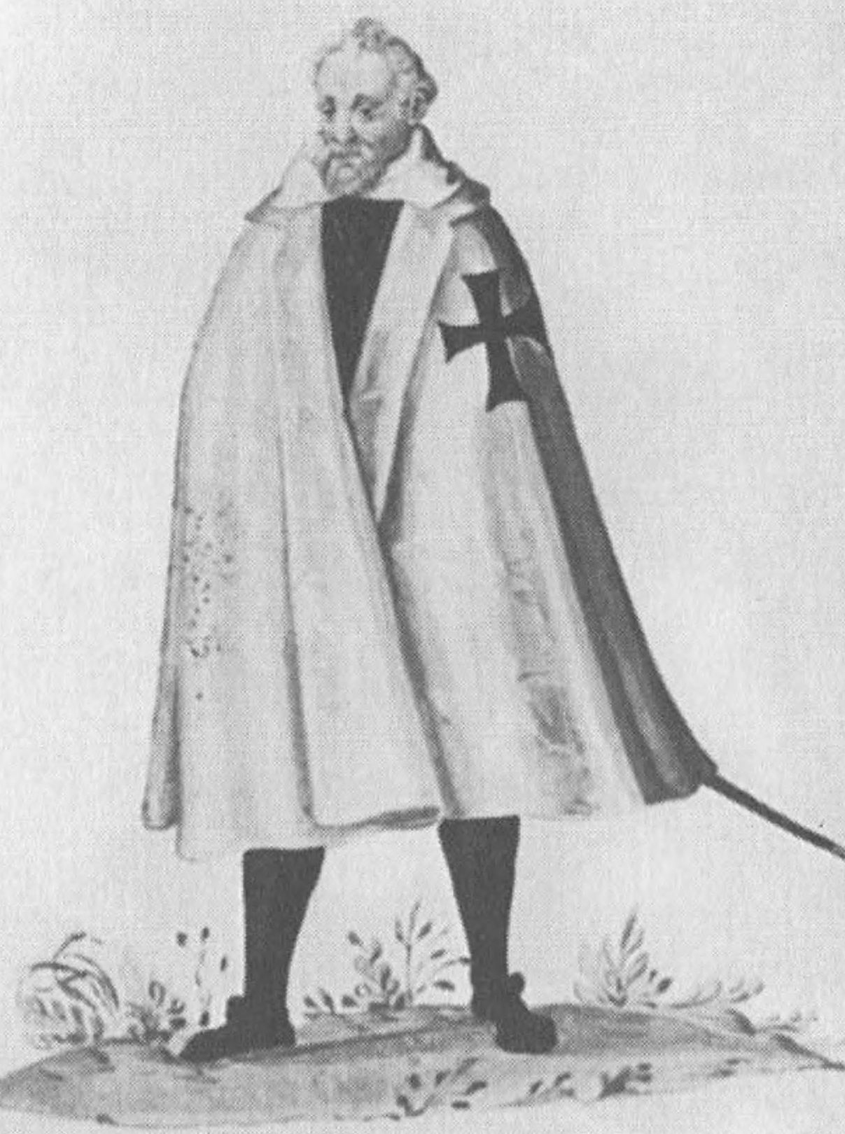 Согласно реформированному в 1606 г. уставу (см. с. 187) изменилась форма креста ордена: простой крест сменился крестом с уширенными концами. В таком виде крест Немецкого ордена послужил прототипом Железного Креста (см. с. 193), но в данном случае первостепенный интерес представляет средневековый крест. Рисунки отражают и то, что в 1606 г. крест на плаще стал больше и тогда же было разрешено носить крест на шее. Одежда рыцарей и священников ордена (см. ил. 12) уже почти одинакова. Правда, под плащом священника — церковное одеяние (сутана), а на голове — церковный убор.