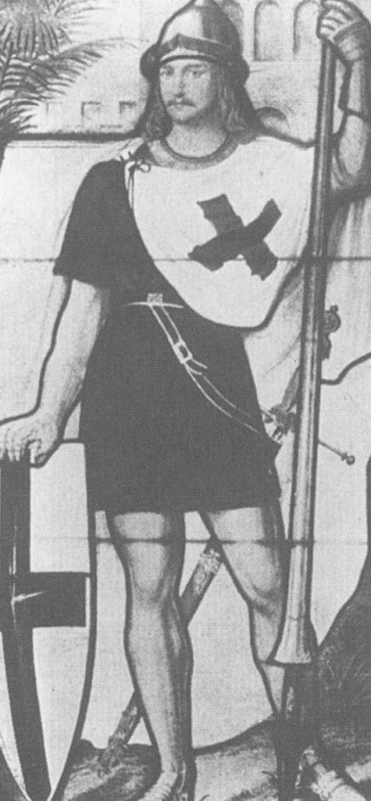Этот и еще 28 щитов висели в церкви Святой Елизаветы в Марбурге как надгробные щиты. Но здесь перед нами не просто надгробный и гербовый щит (см. ил. 8), а один из военных щитов: он раскрашен и с оборотной стороны и имеет скобы, на которых крепились металлические петли. Лицевая сторона деревянного щита обтянута кожей и раскрашена. В голубом поле щита идущий красно-белый полосатый лев. Крест Немецкого ордена (внизу слева), вероятнее всего, был пририсован лишь в XV в. Во всяком случае, уже тогда владельцем щита мыслился Конрад Тюрингский.