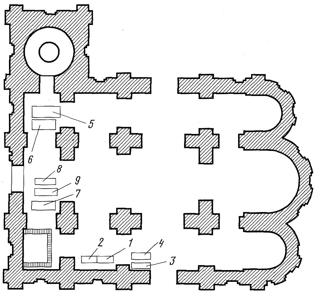 Рис. 51. План некрополя Георгиевского собора Юрьевского монастыря с погребениями: 1, 2 — Изяслава и Ростислава Ярославовичей; 3 — Федора Ярославовича; 4 — Феодосии-Ефросинии; 5 — Мирошки Нездинича; 6 — Дмитра Мирошкинича; 7—9 — монашеские