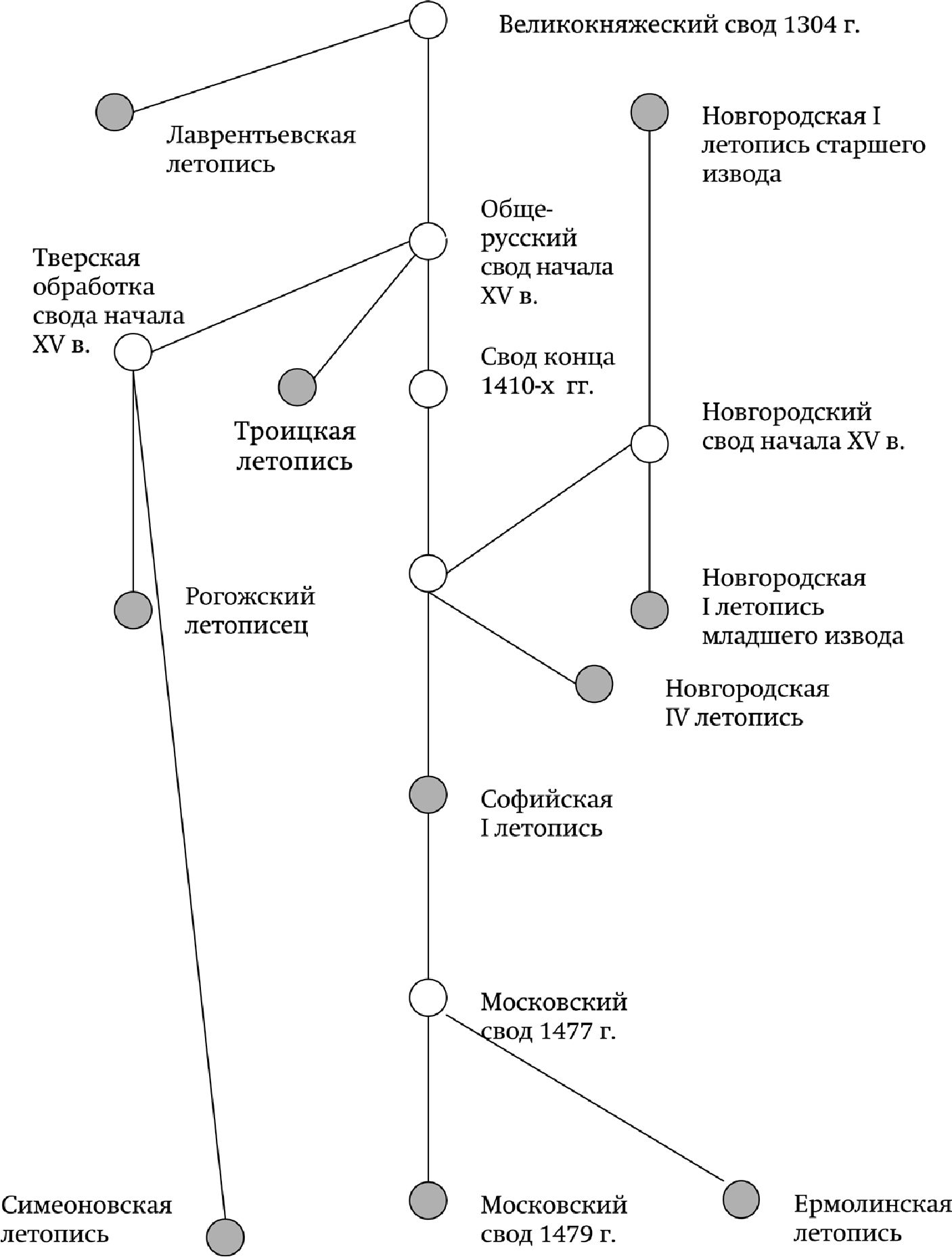 На втором месте после актов по степени информативности в интересующей нас области стоят летописи. Ниже приводится схема основных генеалогических связей использованных в работе летописей XIV—XV вв., с учетом их не дошедших до нас протографов (они обозначены пустыми кружками)42.