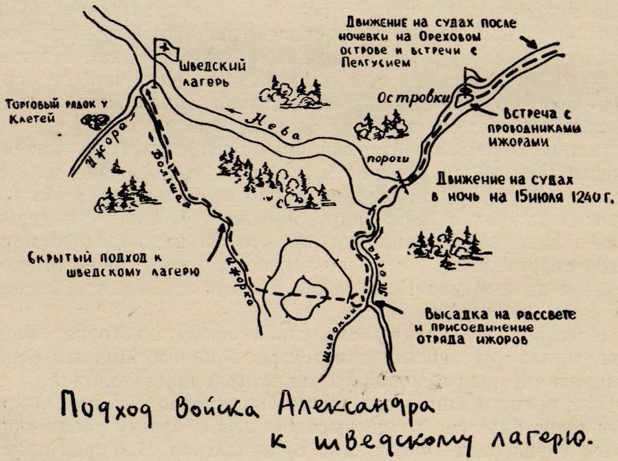 Вся местность в те времена была покрыта сплошным лесом. Впереди войска двигались проводники-ижоры, а поблизости от вражеского стана находились их разведчики, следившие за шведами.