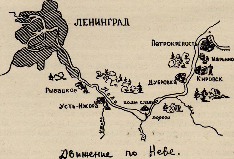 У самого узкого места Невы, против мыса Святки, отряд пристал к правому берегу, и ребята поднялись по его крутому склону. Отсюда открылись просторы Невы и ее берегов. Ниже порогов Нева разлилась чуть не на километр. На правом берегу виднелись домики деревни, которая так и называется — Пороги. За ней возвышались кварталы каменных четырехэтажных зданий. На противоположном берегу дымили трубы предприятий в Ивановском. По его имени и пороги называются Ивановскими. Правее высились краны судоремонтных мастерских в устье Тосны, а за ними дома селения. На самом мысу окруженный темной зеленью высился серый каменный обелиск.