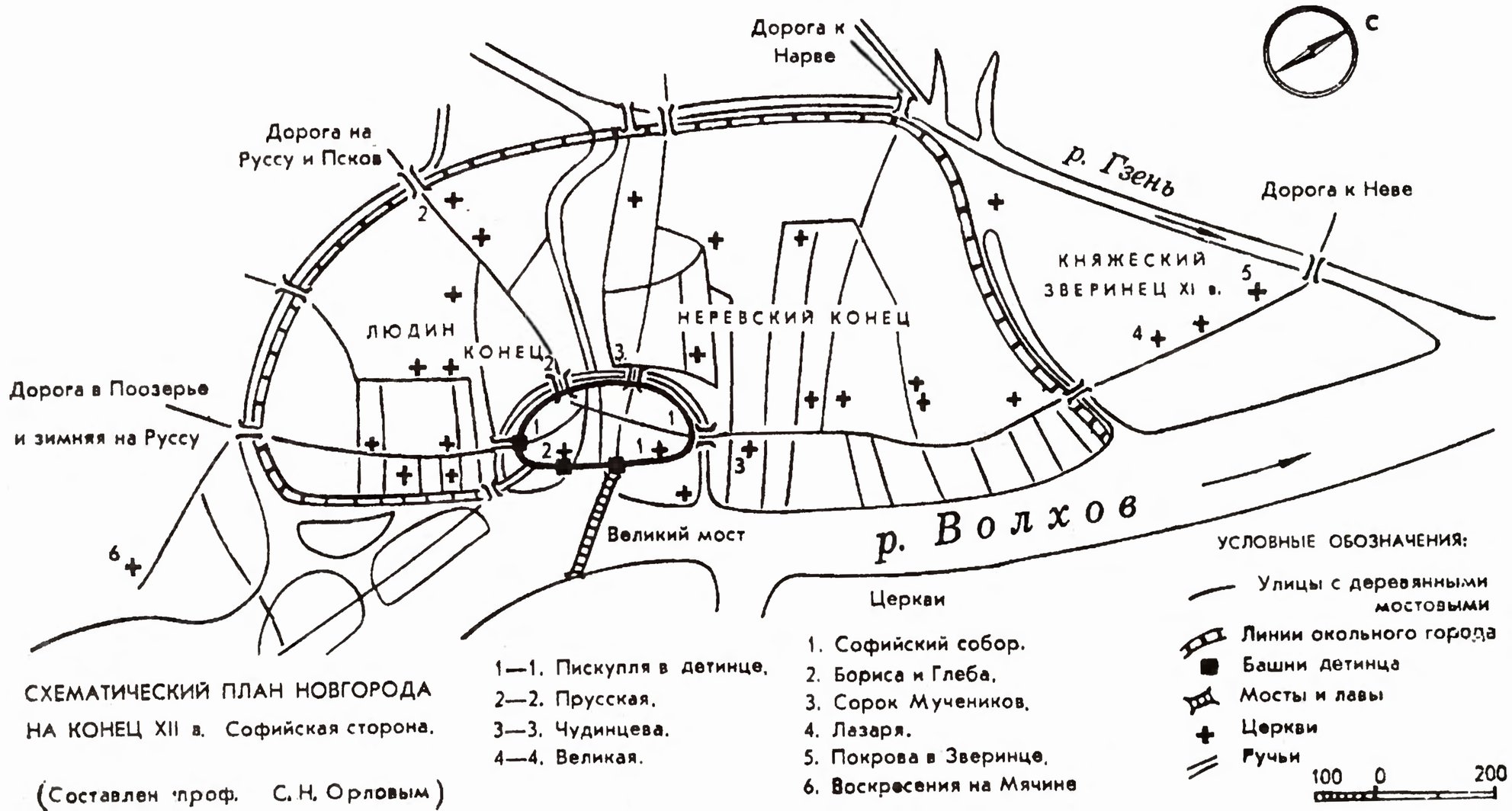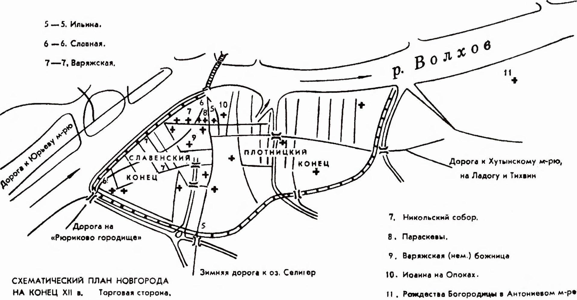 Городские кварталы были окружены земляными валами. Новгород исторически делился на пять районов — концов: Загородный, Наревский и Людинский на Софийской стороне, Славянский и Плотницкий — на Торговой.