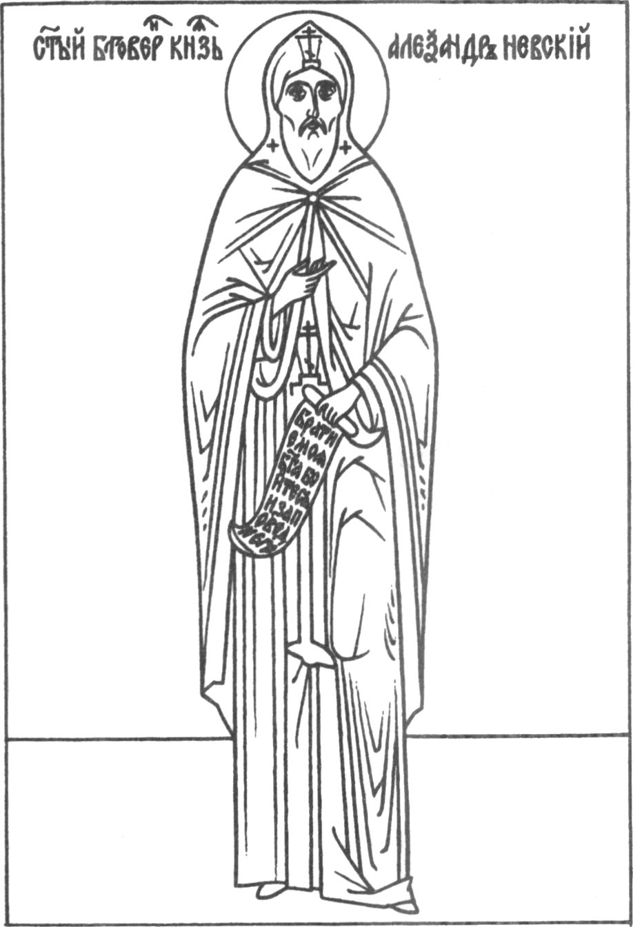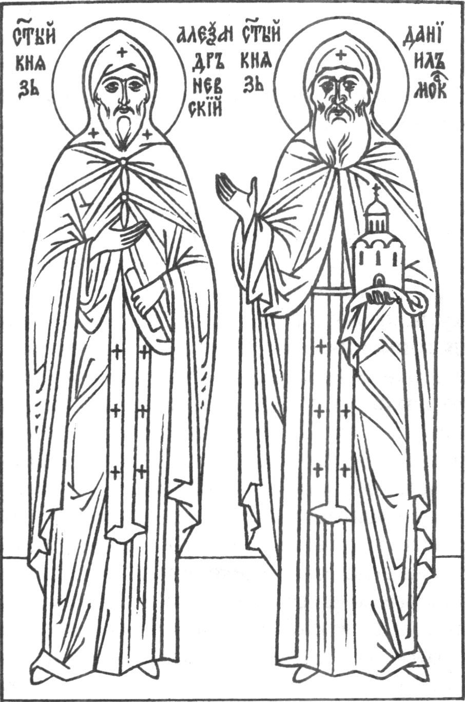 Святой благоверный великий князь Александр Невский, в схиме Алексий и святой благоверный князь Даниил Московский. Рисунок выполнен священником Вячеславом Савиных