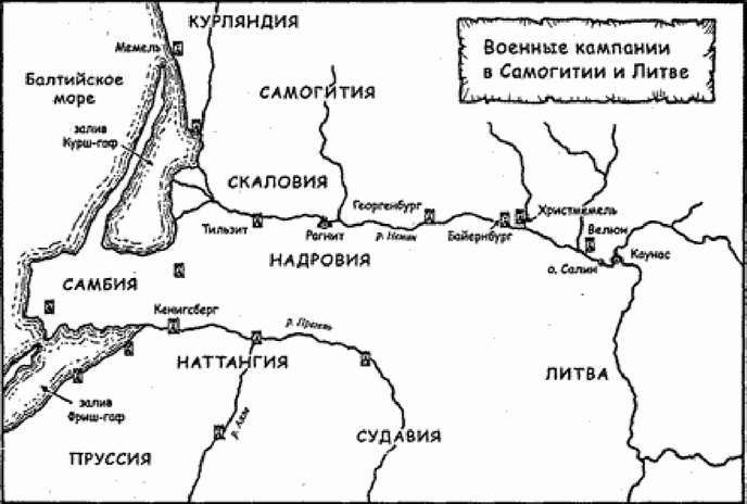 Война в Ливонии закончилась в том же самом году капитуляцией Риги. Хотя горожане ожидали жестокого обращения со стороны рыцарей ордена, им были неожиданно предложены столь великодушные условия, что стороны достигли полного согласия. В последующие годы жители Риги прекратили вмешиваться во внешнюю политику, обратив свои интересы к торговле. Ливонские рыцари теперь находились столь же близко к Вильнюсу и Каунасу, как и прусские, а из Динабурга9 могли вести набеги на недостижимые из Пруссии области Литвы. В короткие сроки они смогли усилить действия прусского ордена против Самогитии.
